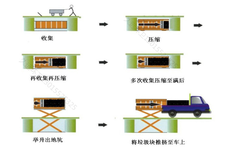 地埋式垃圾中轉站主要特點:1.平穩可靠:兩側舉升,剪叉跨度大,升降平穩,無傾斜。2.全封閉水平壓縮:垃圾壓實密度≧0.86t/m,大幅度節約轉運成本。3.淺地坑:地坑深度僅為1.55m,保潔及維修極為方便。4.高效率:壓實每噸垃圾時間≤10min。 主要技術參考:型號JY-6000載重量(t)>6圧縮力(t)88垃圾塊尺寸3m1.9m1.2m...
