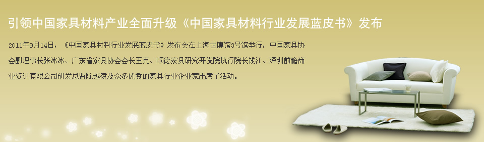 2011年9月14日,《中國家具材料行業發展藍皮書》發布會在上海世博館3號館舉行,中國家具協會副理事長張冰冰、深圳前瞻商業資訊有限公司研發總監陳越凌等出席……[全文]